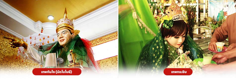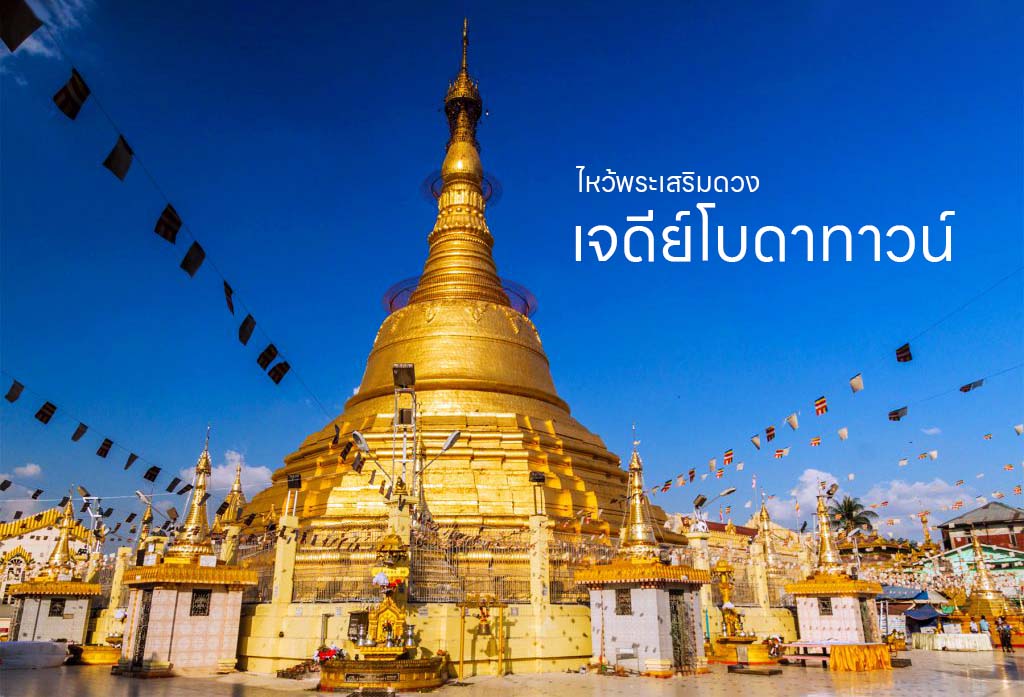 จากนั้นนำท่านนมัสการ เจดีย์โบตาทาวน์ เป็นพระเจดีย์สำคัญอีกที่หนึ่งในเมืองย่างกุ้ง สำหรับเก็บพระเกสาธาตุ (เส้นผม) ขององค์พระสัมมาสัมพุทธเจ้า องค์พระเจดีย์ไม่ใหญ่ ระหว่างทางจะประดับด้วยภาพฝาผนังสีทอง เมื่อมาถึงตรงกลางพระเจดีย์ก็จะสามารถสักการะพระเกสาธาตุที่เก็บไว้ในตู้กระจกได้อย่างใกล้ชิด บริเวณด้านนอกเป็นที่ตั้งของเทพที่คอยรักษาพระเจดีย์ชาวพม่าเรียกว่า “นัตโบโบยี” หรือที่คนไทยรู้จักในชื่อ “เทพทันใจซึ่งเป็นเทพที่ชาวไทยและชาวพม่าให้ความเคารพอย่างมากและนิยมมาขอพรด้วย เชื่อว่าอธิฐานสิ่งใดจะสมความปรารถนา ซึ่งการขอพรจากเทพทันใจต้องไปกระซิบเบาๆห้ามคนอื่นได้ยิน ชาวพม่านิยมขอพรจากเทพองค์นี้กันมาก จากนั้นนำท่านสักการะเทพอีกองค์หนึ่งที่ชาวพม่าเรียกกันว่า “อะมาดอว์เมียะ” หรือที่รู้จักกันว่า “เทพกระซิบ” มีเรื่องเล่าว่านางเป็นธิดาของพญานาค และศรัทธาในพระพุทธศาสนาอย่างแรงกล้า รักษาศีล และไม่กินเนื้อสัตว์ตลอดชีวิต นางบำเพียรเพ็ญจนได้กลายเป็นเทพ ในการขอพรต้องกระซิบและขอได้เพียงเรื่องเดียวเท่านั้น นำท่านเดินทางสู่ พระพุทธไสยาสน์เจาทัตยี (พระตาหวาน) พระนอนปางพุทธไสยาสน์องค์ใหญ่มีความยาวกว่า 70 เมตร มีความงดงามที่สุดของประเทศพม่าทั้งพระพักตร์และขนตาที่งดงาม ดวงตาของ ท่านเป็นแก้วสั่งผลิตมาจากประเทศญี่ปุ่น  โดยเฉพาะรวมไปถึงจีวรที่มีความพริ้วไหวสมจริง และที่พระบาทมีภาพวาดรูปมงคล 108 ให้ท่านได้อิสระไหว้พระขอพรกันตามอัธยาศัย ได้เวลาสมควรนำท่านเดินทางสู่ มหาเจดีย์ชเวดากอง (พระธาตุประจำปีเกิดปีมะเมีย 1 ใน 5 มหาบูชาสถานสูงสุดของพม่า) ตั้งอยู่ ณ เมืองย่างกุ้ง สูง 99 เมตร คำว่า “ชเว (Shwe)” แปลว่า ทอง ส่วน “ดากอง หรือ ตะโกง (Dagon)” เป็นชื่อเดิมของเมืองย่างกุ้ง ดังนั้น ความหมายของ “ชเวดากอง” จึงแปลว่า ทองแห่งเมืองดากอง(ย่างกุ้ง) เจดีย์ชเวดากองนับเป็นมหาเจดีย์ที่มีชื่อเสียงมากที่สุดของพม่า จนมีชื่อเสียงแพร่หลายเป็นที่รู้จักกันทั่วโลก และเป็นหนึ่งในสัญลักษณ์ของพม่า